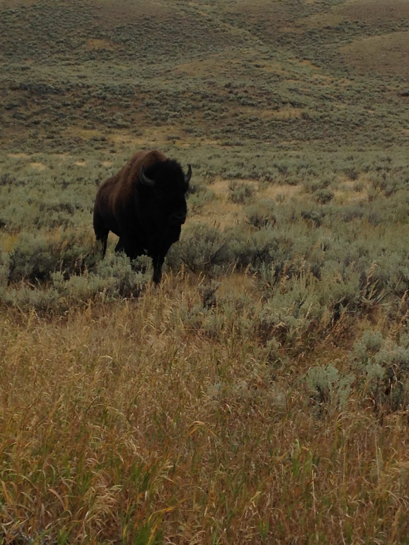 We saw more buffalo on Friday while driving through the Lamar Valley!  They are so beautiful in their natural habitat.  The one in the picture is a bull standing a bit away from the herd and only a little bit away from the road.  Here is the rest of the herd.