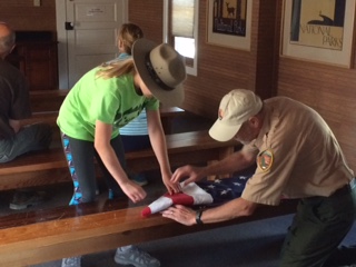 Charis and I have been surprised by a reversal in our “Sharing Stories” expectations. We imagined God setting us up with opportunities to share our “stuff” with others , but it has turned out to be more often the opposite. Folks have been extending their stories and generosity towards us before we even get a chance to initiate. The couple camping next to us are from Seattle and have shared great insights and itinerary tips for our next Canada leg of the journey. They have travelled extensively and knew of places we should see that we had not even heard of. This am a couple shared their firewood. This afternoon was an especially fun share. Holly who is a retired Ranger shared her stories of being a ranger at Camp David during the G-8 Summit. Did you know Camp David is in a National Park? The Ranger in this picture shared with Charis the privilege of lowering the American Flag for the day! We will continue to look for opportunities to share and will also remain open to the abundant way God is blessing us with other people’s sharing hearts.