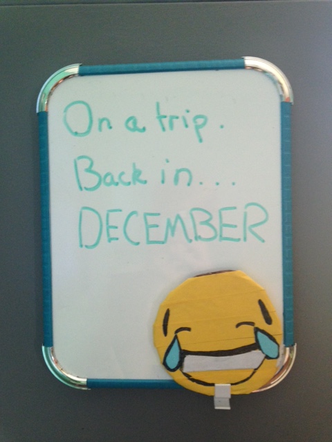 This is the message I left on my whiteboard before we took off in the morning! It feels great to have finally left on the trip we have been preparing for for months.